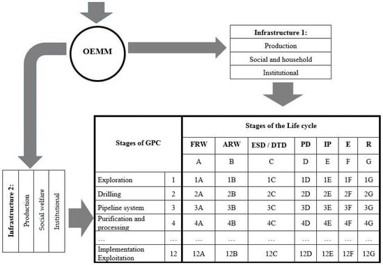 Figure 2 illustrates the possibility of forming a matrix that characterizes the interaction of two infrastructures that ensure the exchange of the stages of the GPC and the steps of the life cycle of the production means. The components of each of the infrastructures—production, social, and institutional—interact not only with each other but also within the framework of the two other infrastructures. In this case, the matrix structure of the interaction of fields is formed. A distinctive feature is the fact that any of the stages of the GPC, in principle, pass all the steps of the life cycle of the production means (horizontally), and any of the stages of the life cycle of the production means pass all the stages of the GPC vertically. In terms of the GPC, in the structure of production and economic activities of the oil and gas complex, there is a consistent transition from the stages of the life cycle of production means and operation of industrial production (operational character of the complex) to the steps of industrial and pilot production and to phases of development, design, and technological works. It should be noted that the infrastructures of both subsystems not only interact with each other but also contain common elements.