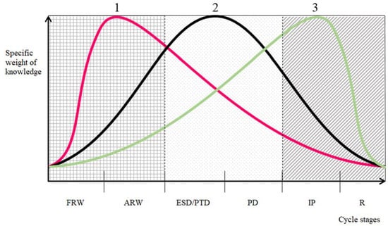The first group of specialists has predominant knowledge in fundamental and applied research, with a decrease in the amount of knowledge in the subsequent life cycle stages. This is a characteristic feature of the academic specialties of universities. The second group of things has shifted maximum in experimental-structural development, design-technological development, and pilot production. The third group of specialties are professionally trained specialists mainly in industrial production and created technical production means.