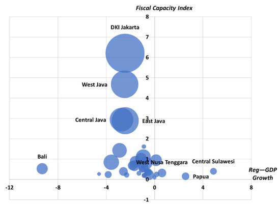 Fiscal Capacity and GDRP Growth 2020 (%, YoY). Note: Size of Bubble: Total revenue from local-own source (IDR) based on 2020 local government budget realization. Source: Ministry of Finance and Central Bureau of Statistics (BPS), processed.