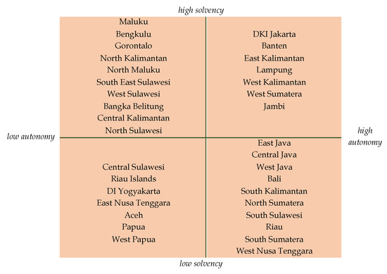 Referring to Figure 5, provinces are divided into four quadrants based on their level of solvency and level autonomy. DKI Jakarta and several other provinces are defined by high solvency and autonomy. Other provinces with a similar fiscal capacity index pattern, such as West Java and East Java, are known to have a lower solvency ratio. We may conclude that, despite their higher level of autonomy and ability to generate local own-source revenue, certain provinces may need to put more effort into managing spending allocation.