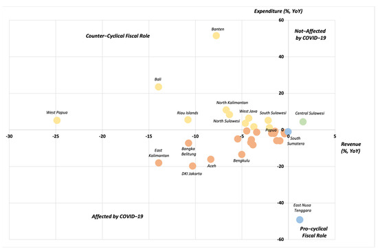 Furthermore, this study evaluates how local governments are dealing with the COVID-19 crisis (Figure 6) by mapping provinces into four categories based on changes in revenues and expenditures during 2020 (the first period of pandemic) compared to 2019 (the pre-crisis period). The first category is the provinces that are not affected by COVID-19, marked by an increase in both revenue and expenditure. The second category is the provinces that implemented a countercyclical fiscal policy during the pandemic, indicated by a decrease in their revenue, but which successfully managed to increase their expenditure. The third category is the provinces that are affected by the COVID-19, shown by a decrease in both revenue and expenditure. This indicates that the local budget was contracted since they could not manage to implement a countercyclical fiscal policy during these bad times through increased spending. The last category is the provinces that implemented a procyclical fiscal policy during the pandemic, marked by an increase in revenue, but experienced a contraction in expenditure side.