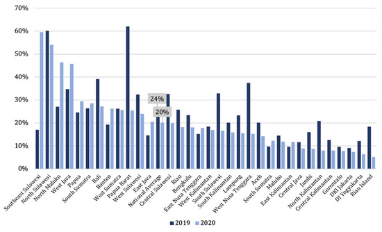 The Ratio of Regional Health Capital Expenditure to Regional Total Health Expenditure in 2019–2020. Source: Directorate General of Regional Fiscal Balance, Ministry of Finance (2020), processed.