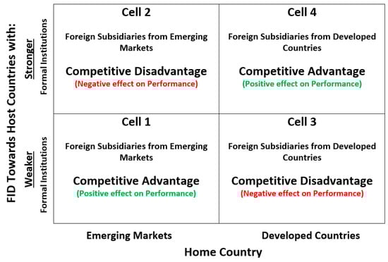 The implications of FID  () argue that formal institutions can support business operations and reduce transaction costs. Therefore, according to the aforementioned authors, the financial performance of foreign subsidiary firms is positively associated with FID towards countries with stronger (i.e., more supportive) formal institutions. In that sense, when operating in a host country with stronger formal institutions, foreign subsidiary firms from emerging markets benefit more when compared to subsidiaries from developed countries as they are exposed to an environment where they can access superior resources not available at their home country. When the distance is in the opposite direction, developed country firms are at a disadvantage as they are used to having supportive institutions and may lack the expertise to operate in their absence (; ). According to  (), “developing such capabilities requires an understanding of what is missing in the environment, and how to operate without those elements”. Emerging market firms, from birth are exposed to unreliable power, congested ports and roads, corrupt bureaucracies, political and regulatory uncertainties, weak educational institutions (), and a range of other “institutional voids” () which force these companies to develop creative strategies and capabilities to deal with such precarious conditions.
