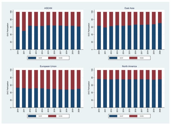 Figure 1 demonstrates that NA had the highest average GVCF participation over the observation period (0.64). Meanwhile, the East Asian countries group had the lowest score (0.46). In terms of backward linkage, the EU has the highest average GVCB participation of 0.44, while NA has the lowest of 0.21. Furthermore, Figure 1 reveals that forward GVC participation by major countries dominates backward linkages.