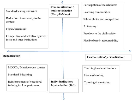 Figure 2 shows some educational areas and practices according to the two first types of tension described. Educational systems and institutions can promote a more customized or more standardised education, or a more multipolar community or more individual bilateral framework. Not all educational areas have a single location in the picture. For example, the promotion of more autonomy for teachers, as in Finland, where they only have to follow certain guidelines, is certainly a way to potentially maximize customization to the needs of the class. However, this may not necessarily be the case, and some teachers may promote a more community-oriented education (reinforcing teamwork), while others promote exactly the opposite by encouraging only individual effort. Moreover, each of the actions and areas proposed can have room to go more into the customized social area or the standard individualistic approach. The same applies to the use of technology, since some digital learning can be customized very little (teacher-led courses) while others can be extensively customized, as in student-centric learning (), the latter representing an innovative and disruptive model.