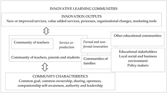 This framework must be complemented by a view of who is designing and implementing innovation in educational services. Interactive co-productions happen between agents that collaborate or co-create new or improved services (e.g., ; ), which is aligned with the concept of smart education (). This happens through what we can call “innovation learning communities”. This refers to communities of teachers, teachers and families, and teachers and parents open to the society. The OECD concept of environment in education can be useful to describe the role of technology, gathering different realities and individuals. However, the community concept refers to something that is not included in the environment idea. The etymological root of “community” is the Latin “communitatem”, which “was merely a noun of quality … meaning fellowship, community of relations or feelings”. An Old English word for community was “gemænscipe”, which means “community, fellowship, union, common ownership” (etymology online). Other related words are society, fellowship, friendly intercourse, courtesy, condescension, and affability. A community is therefore related to something held in common (common ownership) for which people group together (fellowship). This means interactions prevail and face-to-face encounters matter, even if they are not considered a daily obligation, and members of an educational community can meet a few times or even not at all in physical terms, because ICT can replace the need for many face-to-face on site meetings. However, a minimum amount of face-to-face is always needed in a community.