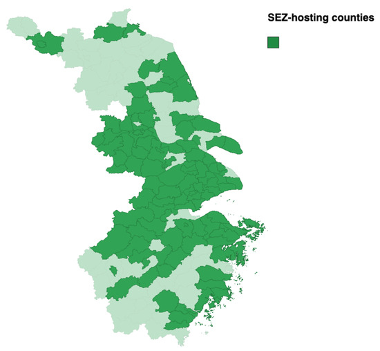 To investigate intra- and inter-regional spillovers from SEZs, we define region as a county in this paper. In Figure 1, we present the counties hosting SEZ programs in Yangtze Delta. SEZ-hosting counties are mainly distributed on the east coast or along the Yangtze River. There are as many as 108 SEZ-hosting counties in Yangtze Delta in 2004, which means SEZ-hosting counties occupy about two-thirds of all the counties in the area.