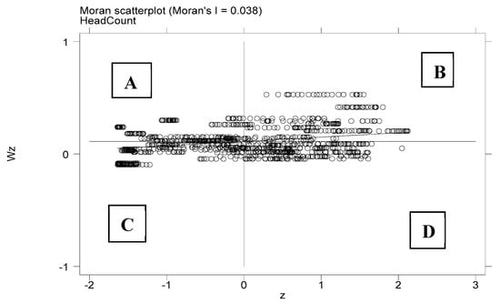 Global Moran’s I spatial autocorrelation statistic. Source: Author’s computation using data from the World Bank database. Quadrant A in Figure 3 are countries with negative spatial clustering of low poverty incidence, while B indicates countries with positive spatial clustering of high poverty incidence, C indicates positive spatial cluster of countries with low poverty incidence, and D is a negative spatial cluster of high poverty incidence.