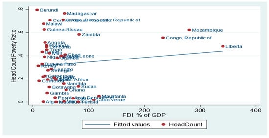 Figure 4 shows a scatter plot of FDI and the incidence of poverty in Africa. The plot reveals that countries with relatively high FDI inflows are characterized with high incidence of poverty. However, countries with low FDI inflows are associated with low poverty rate. This indicates that the level of a countries’ foreign investment is positively correlated with the poverty rate. This is also consistent with the argument of Rye (2016) and Arabyat (2017), who argue that foreign investment increases poverty due to its crowd-out effect on domestic capital. This conjecture is perhaps meaningless and lacks objectivity if not subjected to empirical verification.