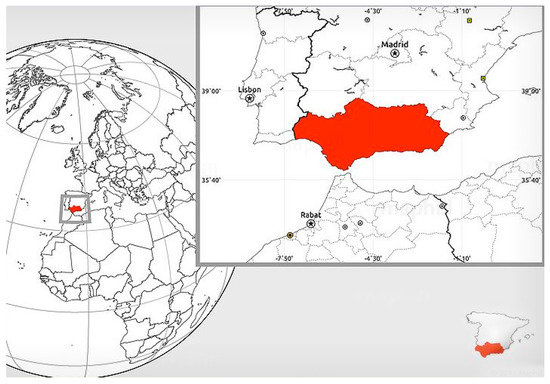The present research was conducted in Andalusia. It is one of the seventeen autonomous communities of Spain. It is located in the extreme southwest of the European Union (Figure 1). Surrounded by two seas and two continents, this distinctive geographical feature has marked its history and has given this territory an open and multicultural identity (Junta de Andalucía 2020).