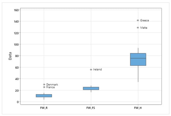It is also evident that countries can be identified as outliers as they have a significantly higher amount of wasted food than other countries. A visual comparison of countries is presented in Figure 2. We assumed that amounts of food wasted in the retail sector, food services, and households should be correlated, but from visual analysis based on Figure 2 it seems that this is not the case. For a deeper analysis of the formulated assumption, we have tested correlations using Pearson’s correlation coefficient, which ruled out the existence of a statistically significant correlation (ρ = 0.1 for all pairs, non-significant at α = 0.05). Therefore, we can conclude that amounts of food wasted from three different sources are not dependent on each other.