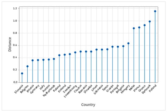 For a better comparison of countries, we have constructed integral variables using the multicriteria evaluation method (distance from the fictitious object), while the Pearson correlation matrix was used to calculate weights of individual variables. The ranking of countries is presented in Figure 3, where the lower distance represents a better position. We assumed that socioeconomic variables (GDP, Gini coefficient, Export, Urbanization, Unemployment) influence the country’s ranking, but there is no statistically significant correlation between them (ρ = <0.1, 0.2> for all variables, non-significant at α = 0.05). This could be caused by globalization of retail and food services sectors and therefore differences are not present.