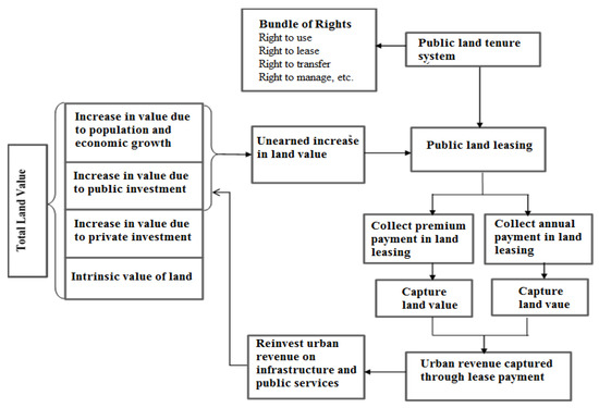A Theoretical framework of urban land leasing as a value capture instrument in a public land ownership system. Source: Constructed by the author by blending the framework from Guyimu (2013); Maina (2014); Suzuki et al. (2015) considering countries with public land tenure systems.