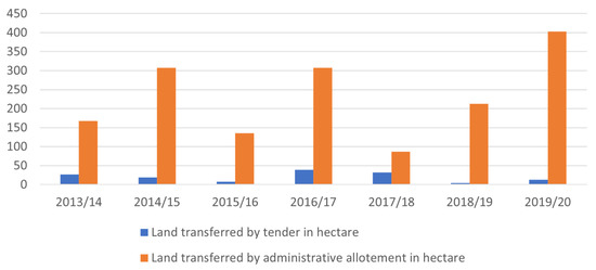 Although the proclamation declares public tender as the primary mode of urban land use rights transfer, the finding indicates that Bahir Dar city has been transferring most of the urban land use rights through administrative allotment. Out of the total land allocated in the city from 2013/14 to 2019/20, the amount of land delivered by public tender constitutes only 9%, which indicates that the city has allocated the majority of its urban land through administrative allotment. The land was allotted for different purposes such as to displaced landholders, manufacturing industries, housing cooperatives, government offices, charity organizations, religious institutions, and others as stipulated in the proclamation. The data indicate that the city has allotted most urban land for manufacturing industries and residential use for people organized in cooperatives. The idea is to encourage private investment in the manufacturing industry and to solve the acute shortage of residential houses in the city. Article 31(2) of the ANRS regulation No.103/2012 has stated that land allocated through administrative allotment should be transferred based on a separate price estimated for each service type or it can be transferred at a benchmark price if it is not possible to estimate a separate price (ANRS 2012). However, the study has pointed out that the city has been delivering land use rights through allotment simply at the benchmark price since it is difficult to estimate a separate lease price for each service type, which adversely affects the lease revenue-generating potential of the city. Regarding the trend of land transferred, the data indicate that the amount of land delivered by allotment has fluctuated from year to year during the period considered (see Figure 4). The key informants stated that the fluctuation occurred due to the political choice of the government in that land transfer through allotment is common during the years of government election since the government needs to maximize its political benefits.