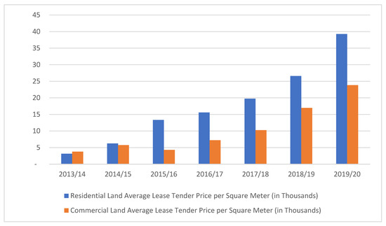 Figure 5 indicates that the average lease tender price of residential land and commercial land has steadily increased during the study period. However, the average lease tender price of commercial land is lower than the average lease tender price of residential land each year mainly starting from 2016/17. It seems that it is contrary to the benchmark price and the theory of urban land price. The key informants have provided the following justifications for this trend. Firstly, the size of commercial lands announced through public tender was larger than the size of residential land in the city. Thus, offering a higher bid price per square meter increases the amount of the advance payment. As a result, lessees may not be encouraged to give a higher lease price per square meter for commercial land. Secondly, a rise in the demand for housing in the city increases the demand for residential land; and it, in turn, intensifies the competition for residential land. Thirdly, most of the urban land leased through public tender locates in the expansion areas where commercial activities do not flourish. As a result, lessees, who need land for commercial use, may not be motivated to offer higher bid prices per square meter in such locality. The study has uncovered that these factors have resulted in, on average, a higher residential land lease price per square meter than that of commercial land in the city.