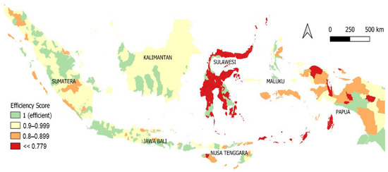 The opposite occurred in the Nusa Tenggara, Maluku, and Papua regions. The average efficiency score of local governments in these three regions decreased during the COVID-19 pandemic. Some local governments in these three regions were slower to adapt to the COVID-19 pandemic, so they could not allocate their spending better. An overview of the efficiency scores of local governments in seven regions during the COVID-19 pandemic is presented in an efficiency map in Figure 1.