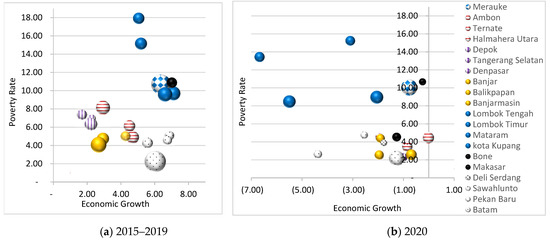 Some local governments can allocate spending well; some cannot. Twenty local governments are always in a good position and always relatively efficient from year to year, as depicted in Figure 2a,b. The following figures show bubble charts explaining the condition of 20 local governments that have always been relatively efficient during 2015–2019 and 2020 in seven regions. The figures explain in more detail and confirm the relatively efficient condition of economic growth, poverty, and per capita spending of each local government in the seven regions presented in Table 2.