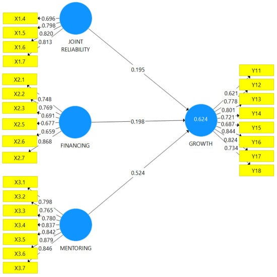 The structural model was analyzed using the bootstrapping procedure suggested by Hair et al. (2014). The t-statistical test is a way to observe the significant effect of the prediction model in the inner model or in other words to see the results of the hypotheses in this study. The t-statistical test is declared influential if the p-value < 0.05 or the t-statistical value > 1.65251. The bootstrapping results (Table 6) show that 3 (three) constructs (variables) namely the Joint Responsibility System (X1), Financing (X2), and Mentoring (X3) have a positive and significant influence on the Growth of Women’s Micro Enterprises (Y). Thus, the results of this research are in line with previous research. The results of this study also indicate that the Mentoring variable is the most significant factor influencing the development of micro-enterprises. This shows that Mentoring needs greater attention to becoming the basis for improving the development of micro-customer businesses in the policy-making process in the future.