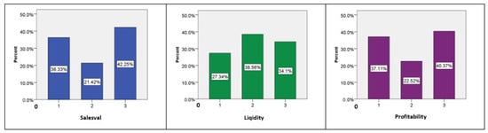This study used three measures of resilience variables, namely sales volume, liquidity, and profitability. Figure 1 shows the distribution of resilience variables based on three categories: “1 = decreased”, “2 = stagnant”, and “3 = increased” from Q1 to Q2 of 2021. From the sales volume and profitability variable, 42.25% of respondents experienced an increase in sales, and 40.37% of respondents experienced an increase in profitability. However, from a liquidity perspective, most of the respondents (38.56%) experienced a stagnant level of liquidity from Q1 to Q2.