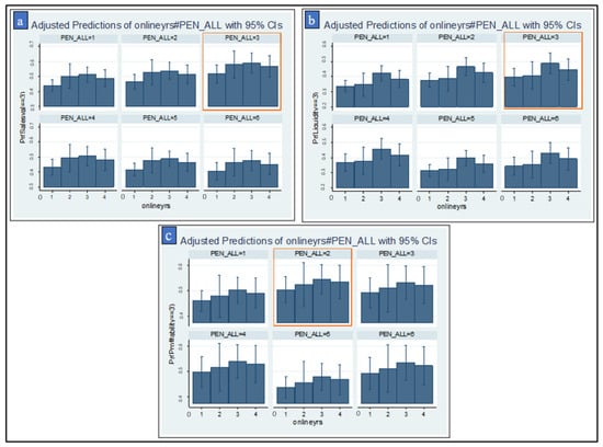 The predicted value of probability showed different results for the measure of profitability resilience. This model showed that the MSME group that had the highest probability of experiencing an increase in profitability was the MSME group that had received category 2 PEN and that has been digitalizing for one to three years. Meanwhile, the MSME group that had the lowest probability of increasing profitability was the MSME group that had received category 5 PEN in the form of restructuring and had not yet undergone digitalization.