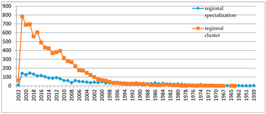 Dynamics of the number of publications that contain the terms “regional specialization” and “regional cluster” in their titles, keywords, and abstracts.