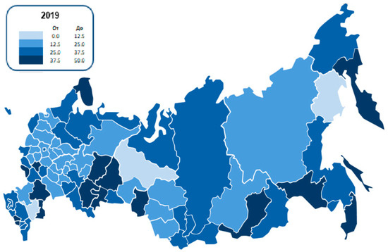 In 2019, the level of sectoral specialization of Russian regions was heterogeneous (less than 10%: 0; 10–20%: 22; 20–30%: 35; 30–40%: 9; 40–50%: 6; more than 50%: 6) (Figure 2). The specialization of the manufacturing industry in St. Petersburg, and the country’s largest industrial centers, was on the verge of 20%. The level of specialization of the largest industrial regions was above 20% (Moscow: 35.62%; Sverdlovsk region: 41.86%; Chelyabinsk region: 40.98%; the Republic of Bashkortostan: 27.62%; Tyumen region:60.21%; Perm Krai: 21.89%; Samara region: 24.62%; Krasnoyarsk Krai: 57.49%). Kamchatka Krai was the highest specialized region of Russia (93.36%), and Smolensk region the lowest one (10.97%).