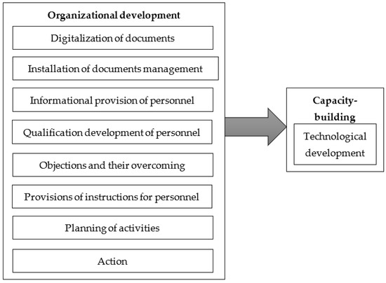 The research results suggested two main stages: organizational development and capacity building. The organizational development phase started with transferring documents to the digital space (“… the creation of electronic files by sending documents electronically”, I4). Later, the document management system was introduced, the staff was informed about it, and training was provided for the staff (“… taught us all”, I2). The phenomenon of employee resistance is often encountered in the implementation of change. The introduction of e-management in municipal administrations was not an exception; therefore, measures had to be taken to reduce resistance (“There were many objections at the beginning, everyone wanted paper work,” I2; “Of course, there was much resistance from people who wanted to see the original document”, I2). After solving or minimizing the problem of employee resistance, the staff was given instructions (“… we just got instructions”, I2), work planning was started (“… we started planning our work”, I4), and the work itself was done (“… we worked”, I2). Only technological development was carried out during the capacity-building phase (“After the system was updated …”, I2). In the capacity-building phase, the implementation of e-management has stopped. Interviews with management staff did not provide any insight into the continuation of this process.