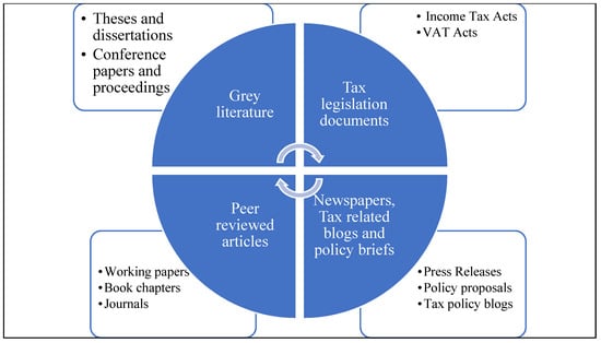 For this study, a critical literature review approach was adopted for reviewing the literature sources described in Figure 2. The researchers adopted this review method because it allows in-depth and critical analysis of literature in the subject area and can show the knowledge gaps in the literature, as well as policy gaps (Mpofu 2021b; Snyder 2019). The researchers searched the Scopus database as well as the Google Scholar database for articles to consider in the review. The researchers employed key search terms including “Digital services taxes (DTSs) in Africa”, “the structure of digital services taxes in African countries”, “Digital services taxes in Africa and Digital Financial Inclusion”, and “Digital financial inclusion and the Fourth Industrial Revolution in Africa” and “The effect of digital service taxes in African economies”, among others. The search yielded several articles from organizations such as the World Bank, the International Monetary Fund, the ICTD, the Africa Portal, and the Institute of Development Studies, as well as journal articles from different journals. These articles were reviewed for relevance to the study by considering their tittles, abstracts, and introductions.
