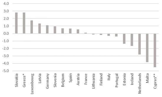 General government balance forecast error% GDP (median 2006–2019). Source: Eurostat, database and author calculations. * For 2014–2016, the forecasts from the Medium-Term Fiscal Strategy Framework 2015–2018 were used, while for the years 2017 and 2018, forecasts were from the Medium-Term Fiscal Strategy Program 2018–2021. ** For Cyprus, median is calculated without the years 2014–2016.
