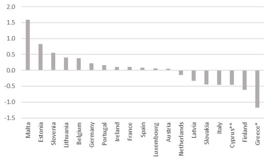 Figure 6 shows the errors of forecasting the annual percentage change of GDP for the Eurozone countries of our sample. Regarding the countries that joined the EAP, Greece achieved the worst negative error, while a negative error is also observed for Cyprus. On the contrary, a positive growth forecast error is presented for Portugal, Spain and Ireland. Further, Greece and Cyprus showed a bias or inability to forecast GDP and mainly overestimated the potential for economic development.
