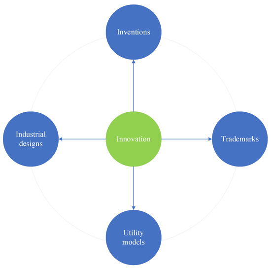 Patents are the main source of data used in this study, for which patent information recorded from 1991 to 2020 (30 years) was retrieved. The mission of Kazakhstan’s patent system is aimed toward the provision of necessary and sufficient legal, informational, and institutional conditions for a favorable innovative climate for manufacturing products and services in Kazakhstan, with protected rights of intellectual property and ratification of the country as an equal and competitive partner of international economic relations in the context of globalization (National Institute of Intellectual Property of the Ministry of Justice of the Republic of Kazakhstan 2021). The main body responsible for the patent issues in Kazakhstan is the office of the National Institute of Intellectual Property of the Republic of Kazakhstan (National Patent—Kazpatent). Kazpatent was established on 23 June 1992, a year after the country declared independence from the USSR. The study also captured trademarks (a form of intellectual property that consists of a recognizable sign, design, or expression used to identify goods or services as coming from a specific source, and set them apart from those offered by other parties), utility models (registered property that allows the holder to use a technological invention only in a specific manner), as well as industrial designs (product’s artistic and design solution, which decides how it will look). Figure 1 summarizes some of the innovation objects discussed in this study.