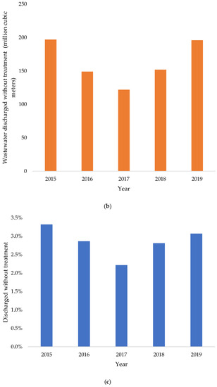 Polluted wastewater: (a) total amount of wastewater generated, million cubic meters; (b) amount of wastewater discharged into the environment without treatment, million cubic meters; (c) percentage of wastewater discharged into the environment without treatment.