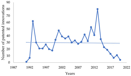 With the fact that the global population is estimated to reach 9.7 billion people by 2050, it has never been more important to produce more with less. From Figure 5, it can be observed that the trend of innovation activities in the water sector has been decreasing with time, despite the fact that the entire world has recently been under many challenges related to water. There was an interesting increase in terms of patented innovations from 1991 to 1993, which then reduced significantly from 1993 to 1994. Moreover, from 2012, this number has been sharply decreasing, calling for immediate action in the sector. As previously mentioned, as the water supply and sanitation sectors continue to face increasing pressures, especially due to factors such as changes in climatic conditions and population growth, the governments in developing countries need to increase the resilience and sustainability of the water sector. To achieve this, innovation and technology have a vital role in addressing these issues. All over the world, one of the main reasons why innovations fail is due to an unfulfilled commitment and a lack of support for innovation. As a result, numerous resources are wasted due to friction, and innovation activities are not completed to the appropriate standard (Rhaiem and Amara 2021).