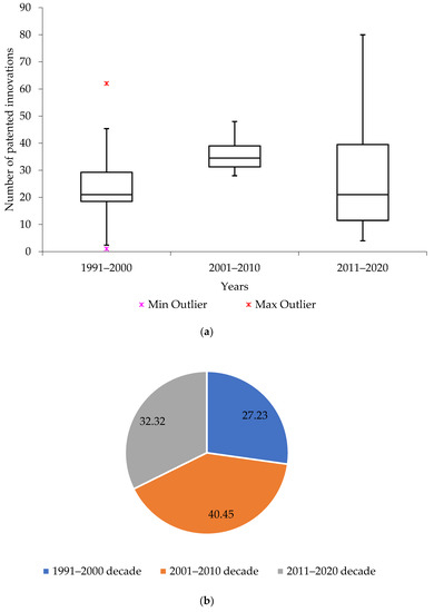Innovations per decade (a) data distribution (box and whisker plot) for the three decades, (b) percentage of innovation within the three decades.