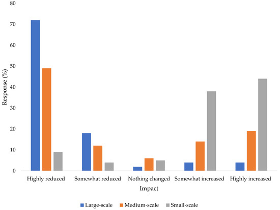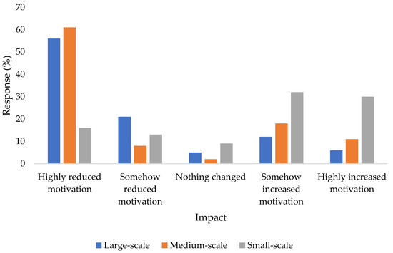 Countries all across the world fought the COVID-19 pandemic for much of 2020 (Ramalho et al. 2022; Jribi et al. 2020), and continue to do so. This was in order to combat the virus’s rapid spread, and many countries went into lockdown. The lockdown’s unprecedented constraints and seclusion posed new obstacles in people’s daily lives. In such a situation, creativity can help people cope with harsh and difficult conditions since it is based on flexibility, adaptability, and problem-solving. From Figure 9, it can be observed that, similar to how the COVID-19 situation has been impacting the general motivation of the water firms to work more in innovative activities, the level of investment in water innovations, as determined by the level of funding, has also been observed to be more strongly impacting large-scale firms than the small-scale firms. The results derived in this study also agree with the results obtained by Xin Jin et al. (2022), in which, the authors concluded that COVID-19 has a stronger detrimental impact on the innovation quality of state-owned firms than it does on non-state-owned enterprises; while at the company level, COVID-19 has a greater impact on major organizations’ innovation than on small- and medium-sized businesses.