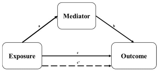 The intercept is denoted as i in all equations, and the error term is ε. The overall effect of the exposure variable on the outcome variable is outlined by c in Equation (2). The impact of the exposure variable on the mediator variable is given in Equation (3). The direct impact of the exposure variable on the outcome variable is expressed by c′, and the indirect effect of the mediator variable on the outcome variable is given by b in Equation (4). Equations (5)–(7) are from Model 2.