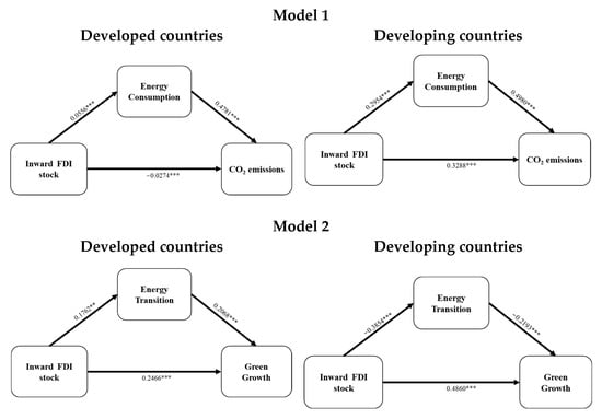 The Sobel test reveals that 2969% of the effect of FDI on CO2 emissions is mediated by energy consumption in developed countries. In developing ones, the amount mediated is approximately 31%. Regarding Model II, the effect of FDI on Green Growth is approximately 13% mediated by energy transition in developed countries and 15% in developing countries. FDI has a statistically significant impact on CO2 emissions via energy consumption in both developed and developing countries, which verifies H1. The mediating effect of the energy transition on the impact of FDI on Green Growth uncovers that energy transition can be an ally to ensure FDI drives Green Growth, thus H3 is verified.