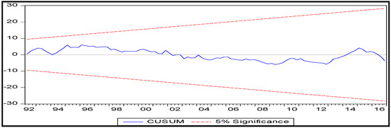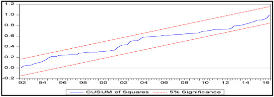 Two stability tests were conducted, which were the CUSUM of squares test and CUSUM test, and are reported in Figure 1 and Figure 2, respectively. At a 5% significance level, we can conclude that, using both the CUSUM test and CUSUM of squares test, the model was stable, as Figure 1 and Figure 2 reveals that the cumulative sum did not go outside the critical lines.
