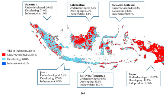 Rencana Pembangunan Jangka Menengah Nasional (National Medium-Term Development Plan) 2015–2019 outlines the development goals that must be reached during the next five years in the country. The goal is to decrease the number of underdeveloped villages by 5000 and improve the number of advanced villages by 2000. Figure 2a,b show the maps of villages by VDI in 2014 and 2018. Most independent villages are located on Java and Sumatra islands, whereas the underdeveloped villages are located on the islands of Kalimantan, Sulawesi, and Papua.