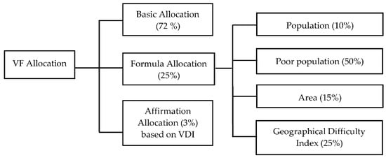 During the initial implementation of the VF policy in 2015, the Indonesian government set the amount of VFs in each district based on the concept of equity. The VF transfers were divided into a basic allocation (90%) and a formula-based allocation (10%). The basic allocation is distributed evenly based on the number of villages in each district, whereas the formula-based allocation considers population size, poor population size, area, and geographical difficulties. According to Lewis (2015), the implementation of VFs in the country was excessively hurried and unplanned, with only a small fraction of the formula allocation considering Indonesia’s uniqueness and diversity. A reformulation of VF distribution is required to speed up poverty alleviation, eliminate inequality, and provide incentives for highly underdeveloped and underdeveloped villages with a high number of poor people. Therefore, the government improved the policy by modifying the VF allocation pattern to one that considers village characteristics, such as population size, inadequate population size, geographical difficulties, and expensive construction (Figure 3).