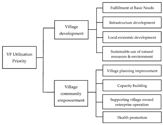 As stated in the Ministry of Village Regulation No. 5 in 2015, VFs are prioritized to achieve village development goals (including enhancing rural welfare, improving the quality of human life, and eradicating poverty) and community empowerment. VFs fulfill basic needs and promote infrastructure development, local economic development, and the sustainable use of natural resources and the environment (Figure 4). The use of VFs for community empowerment is realized through the following four priorities: village planning improvement, capacity building, supporting village-owned enterprise operations, and health promotion.