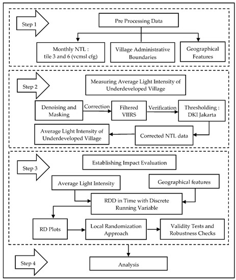 We used four main steps to evaluate the impacts of VF transfer on underdeveloped villages in Indonesia. First, we collected basic data for impact evaluation. Second, we corrected NTL data by referring to previous studies. Third, we evaluated the impacts of VFs on rural economic growth using the RDD. Finally, we analyzed the results (Figure 5).