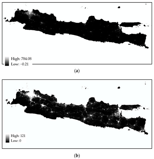 (a) NTL data before the correction process on Java Island, June 2019. (b) NTL data after the correction process on Java Island, June 2019.