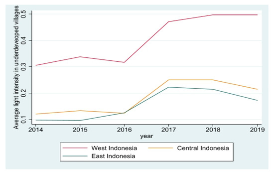 Before the description of the core results of the RDD method, examining the ALI in underdeveloped villages in Indonesia from 2014 to 2019 is instructive (Figure 7). Indonesia is often divided into the west, central, and east regions. Each region contains islands, which are as follows: