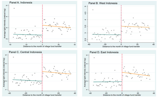 Meanwhile, covariates in the RDD estimates reveal a similar magnitude of VF impacts with a higher coefficient. Table 3, Panel B, presents the RDD estimates with covariate variables. We find strong evidence that VFs help to improve rural economic growth. Since VF transfer has been implemented, rural economic growth in East Indonesia has dramatically increased by 155.9%. Our findings show that remote areas have experienced higher increases in rural economic growth. By contrast, as a developed region, West Indonesia has experienced the least increase in rural economic growth after the implementation of the VF transfer. The comparison of the two results, the RDD with and without covariates, provides strong evidence that VFs improve the rural economic growth in underdeveloped villages in Indonesia, with poor regions growing faster than rich regions. This surprising result may indicate convergence, which could be the starting point of further research.