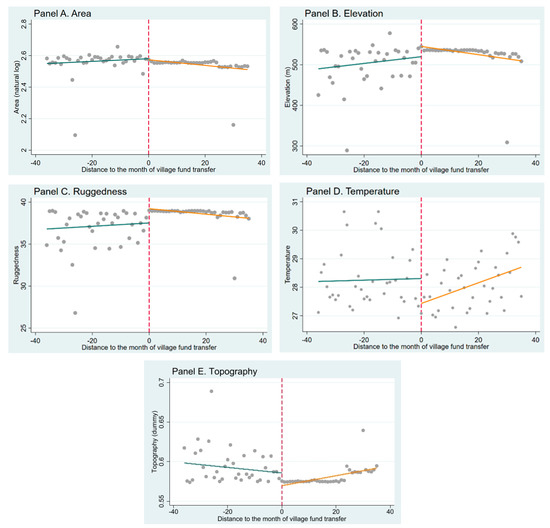 RDD in time on covariates. Note: as described in Equation (2), the gray dots reflect the covariates before and after the policy. The green and yellow lines represent the fitted curves. The vertical dashed line denotes the month of the VF transfer’s full implementation in January 2017.