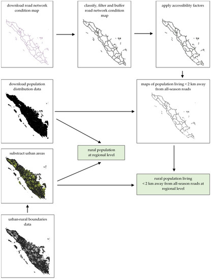 The first step was to calculate the RAI at the district level. The RAI needs several datasets: population distribution maps, urban–rural classification data, village maps, road maps, and road network condition data. Step-by-step procedures for calculating the RAI are shown in Figure 1.