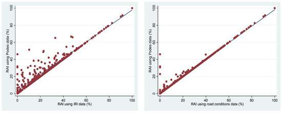 WorldPop data were chosen for the population layer because the computational process underlying the WorldPop data is fully transparent (Stevens et al. 2015), and the model is considered to be the most accurate and robust among the currently available datasets (World Bank 2016). From three methods using WorldPop data, the descriptive statistics of RAI at the district level were similar. The RAI using IRI, road condition, and Podes data had means of 23.41 per cent, 25.21 per cent, and 25.71 per cent, respectively. These data are also in line with the scatter plots in Figure 2. The Pearson correlation between RAI using Podes data and RAI using IRI data was 0.9475. Furthermore, the correlation between RAI using Podes data and RAI using road condition data was also positive, with a Pearson correlation coefficient value of 0.9833. A one-way analysis of variance (ANOVA) was also used to assess whether there were differences between the three methods. The results concluded that there were no differences between the group means (F (2,1322) = 2.01, p = 0.135)1.