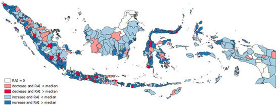 The majority of districts with a high RAI are located in four regional groups: Sumatra, Java, Bali and Nusa Tenggara, and Sulawesi. RAI was low in most districts in Borneo, Moluccas, North Moluccas, Papua, and West Papua. During the same time period, 77.38 per cent of districts had a higher RAI. The positive change in RAI occurred in districts with a low RAI, namely in eastern Indonesia, which is the priority of the Nawacita programme (see Figure 4). This shows that the Nawacita programme implementation was relatively successful.
