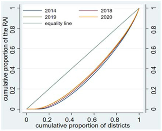are the mean, standard deviation, coefficient of variance, Gini coefficient and Theil index year t, respectively. is the cumulative proportion of the population variable in the smaller region i = 1, …, n year t with and . is the cumulative proportion of the RAI variable in the smaller region i = 1, …, n year t with and . should be indexed in non-decreasing order () and is generated by arranging regions in ascending order based on the RAI values. A lower variation coefficient value indicates a more equitable distribution.